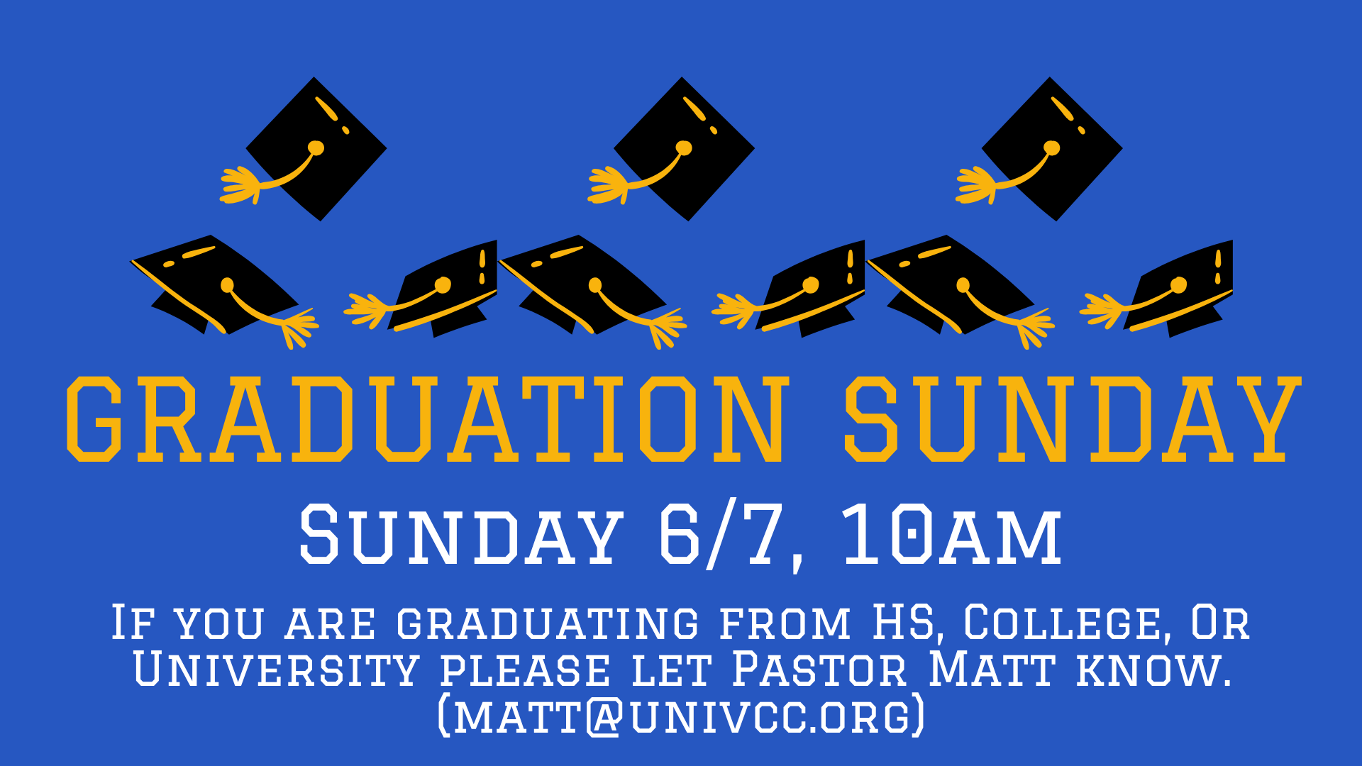 On Sunday June 7th, we will be celebrating our Class of 2026 High School, College and University Graduates! If you are graduating and want to participate please contact Pastor Matt (matt@univcc.org).
