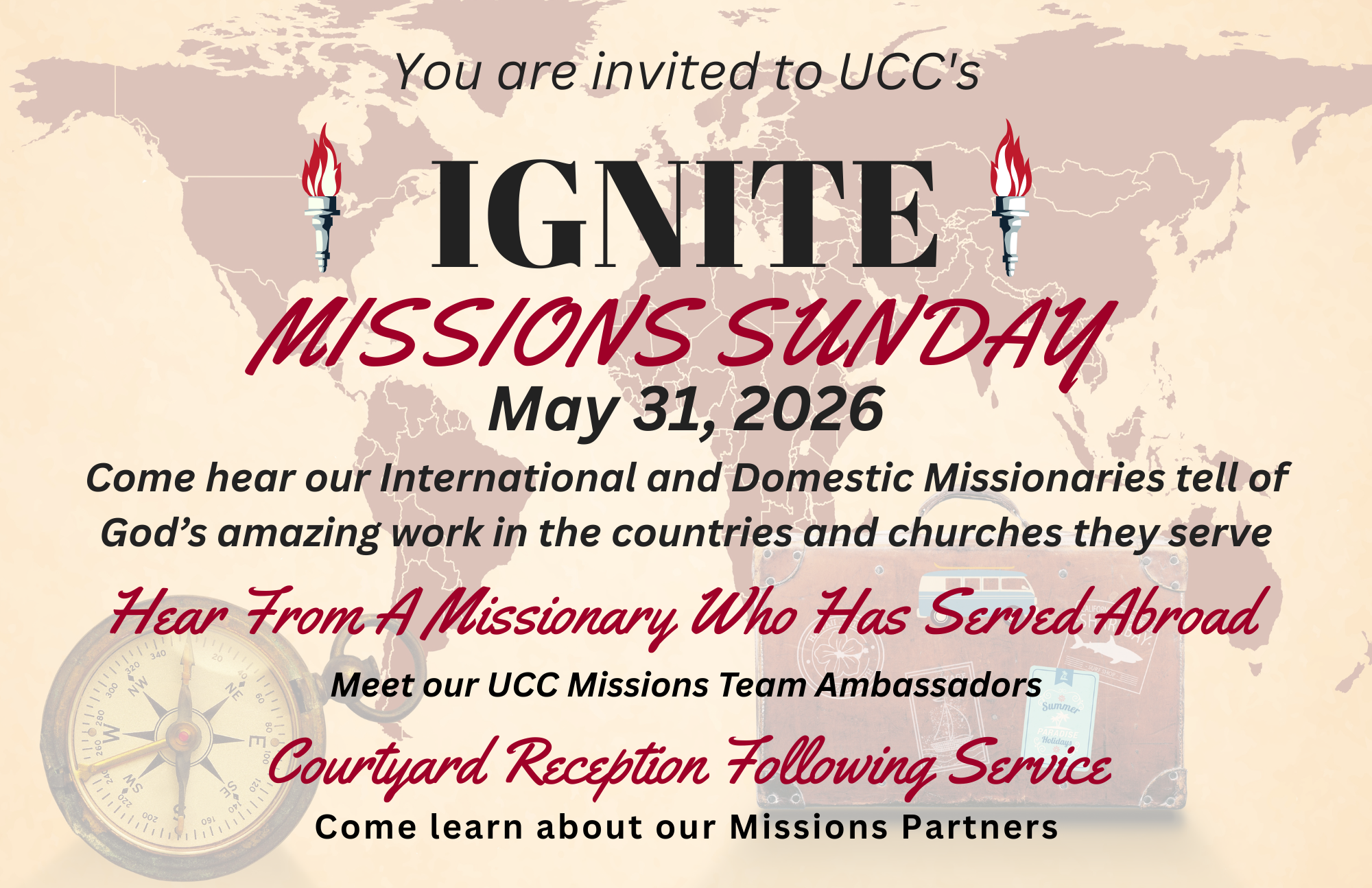 Join us on Sunday May 31st at 10am for Ignite Missions Sunday to hear how God is working through our Mission Partners. Hear from one of our Missionaries who has served abroad and meet our new UCC Missions Team Ambassadors and hear from them about our Mission Partners serving in the field.